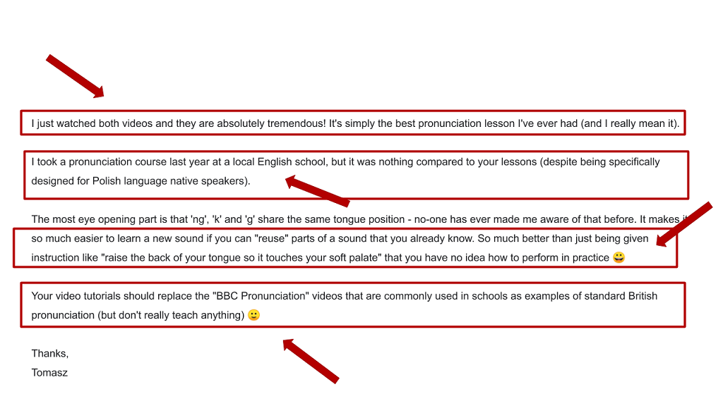 Step by step tutorials that will show you where your pronunciation difficulties are... and then follow along to the tutorials as you overcome your frustrations one by one